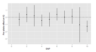 But what about Heneghan’s concern about the reliability of the results? This is something that also worried me when I scrutinised Table 1, which shows for each genetic locus the ‘per allele’ effect on IQ. I’ve plotted the data for child genotypes in Figure 1. Only one SNP (#10) seems to have a significant effect on child IQ. Yet when all loci were entered into a stepwise multiple regression analysis, no fewer than four child loci were identified as having a significant effect. The authors suggested that this could reflect interactions between genes that are on the same genetic pathway.