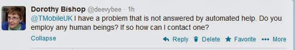 I'd previously battled with the TMobile website to try and find a phone number for human help, and completely failed. All the encouraging tabs offering help lead you to a hopeless set of FAQs that are totally irrelevant to the problem at hand - or they try to lure you down the 150 cul-de-sac.