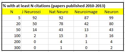 So does this mean, as implied by the Journal of Neuroscience marketing, that authors should preferentially send their papers to Neuron or Nature Neuroscience, because this will lead to them being more highly cited? The answer is almost certainly no. I took at quick look at the most highly cited papers in these four journals, and some common themes occurred. If you want to be highly cited, you should write a paper that is either (a) a review of the field or (b) reports a methodological advance. And the reviews, which I suspect are mostly commissioned, are by famous people. Furthermore, my impression was that empirical papers on molecular neuroscience were more highly cited than those on cognitive neuroscience – I leave that for someone even more nerdy than me to confirm.