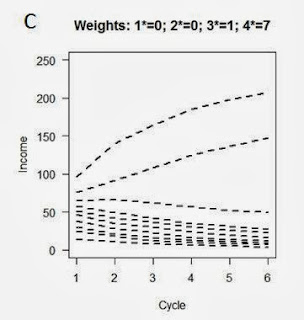 With regard to (b), in the previous exercise, the RAE, you got one point for 2*, three points for 3* and seven points for 4*. It is anticipated that this time there will be no credit for 2* and little or no credit for 3*. I've simply computed the sums according to two scenarios: original RAE, and formula where only 4* counts. From these scores one can readily compute what percentage of available funding will go to each institution. The figures are below. Readers may find it of interest to look at this table in relation to my earlier blogpost on The Matthew Effect and REF2014.