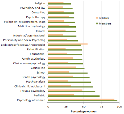numbers of members and fellows in its different Divisions. The APA is predominantly a professional organisation, and non-applied areas of psychology are not strongly represented in the membership. Nevertheless, one can see clear gender differences, which generally map on to the expectation that women are more focused on the caring professions, and men are more heavily represented in theoretical and quantitative areas. Figure 3 shows relevant data for sections with at least 700 members. It is also worth noting that the graph illustrates the decrease in the proportions of women going from membership to fellowship, a trend bucked by just one Division.