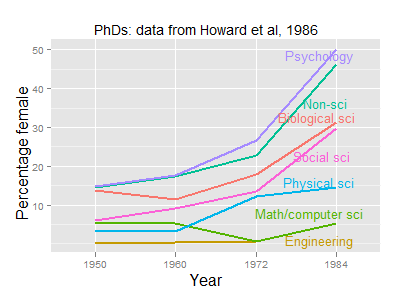 data from the USA show a sharp increase in the proportion of women obtaining psychology doctorates from 1960 (18%) through 1972 (27%) to 1984 (50%). This, of course, is in part a consequence of the increase of women in higher education in general. But that isn’t a total explanation: Figure 2 compares proportions of female PhDs over time in different subject areas, and one can see that psychology shows a particularly pronounced increase compared with other disciplines.