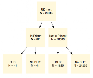As you can see, according to this scenario, the probability of going to prison is much greater for those with DLD than for those without DLD (2.24% DLD vs 0.17% without DLD), but the absolute probability is still very low – 98% of those with DLD will not be incarcerated.