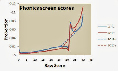 The evidence of the parlous state of UK education came from consideration of the range of scores from best (95th percentile) to worst (5th percentile) for children in England. Now this is where I think it gets a bit dishonest. Suppose there were a massive improvement in scores for a subset of children, such that the mean and highest scores went up, but with the lowest scoring still doing poorly; presumably, the shrill voices would get even shriller, because the range would extend even further. This seems a tad unfair: yes, it makes sense to stress that the average attainment doesn't capture important things, and that a high average is not a cause for congratulation if it is associated with a long straggly tail of poor achievers. But if we want to focus on poor achievers, let's look at the proportion of children scoring at a low level, and not at some notional 'gap' between best and worst, which is then translated into 'years' to make it sound even more dramatic.