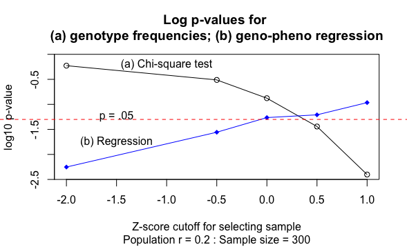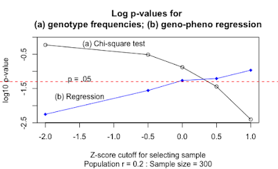 already well-known to geneticists, and it's all pretty obvious to anyone who is statistically savvy, but I was pleased to be able to quantify the effect via simulations. It is clear that it has implications for those who work